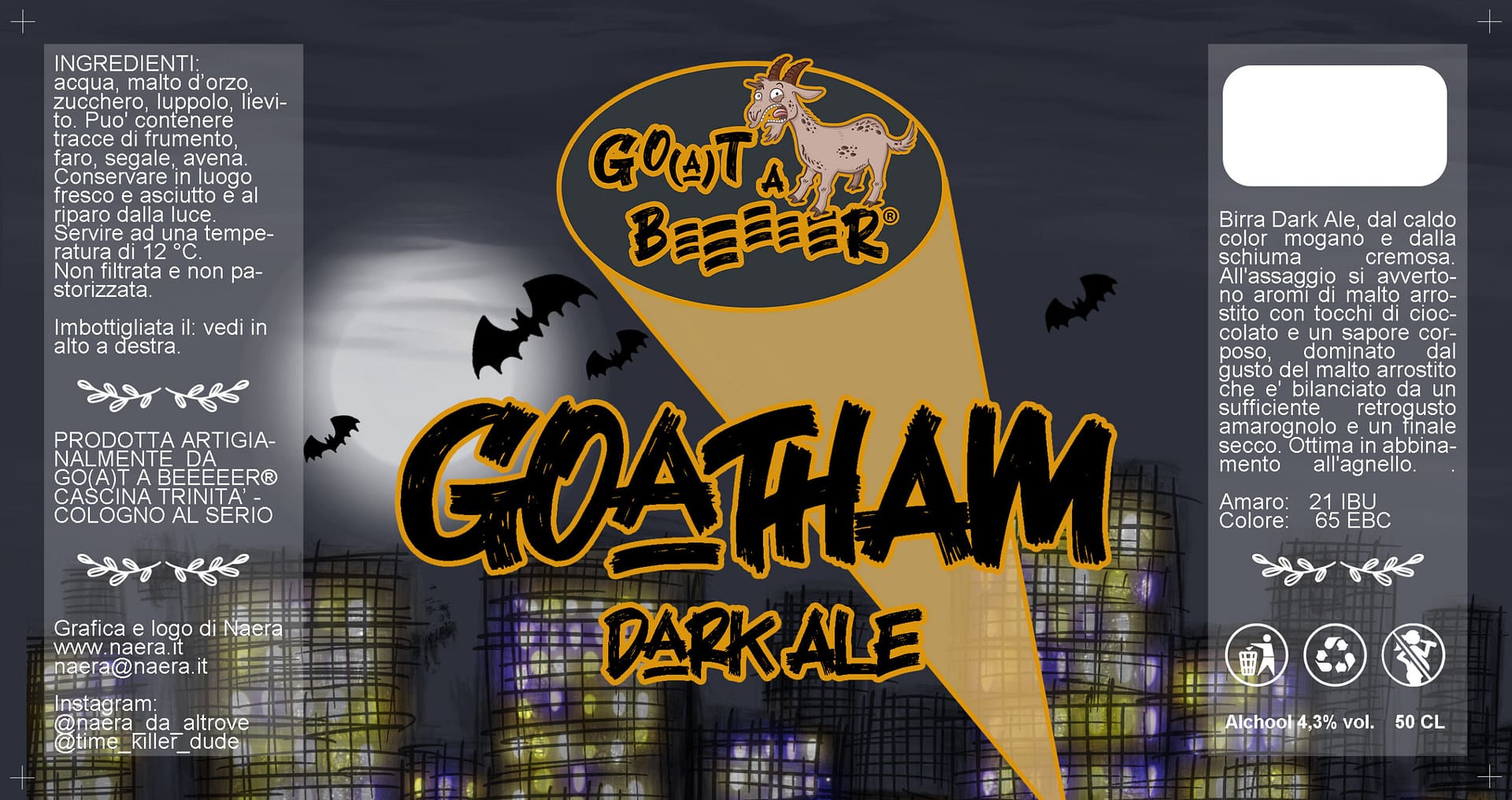 Etichetta per la birra artigianale “Go(a)tham” e marchio per il birrificio casalingo “Go(a)t a Beer“, giocando con la parola goat, ovvero capra in inglese.