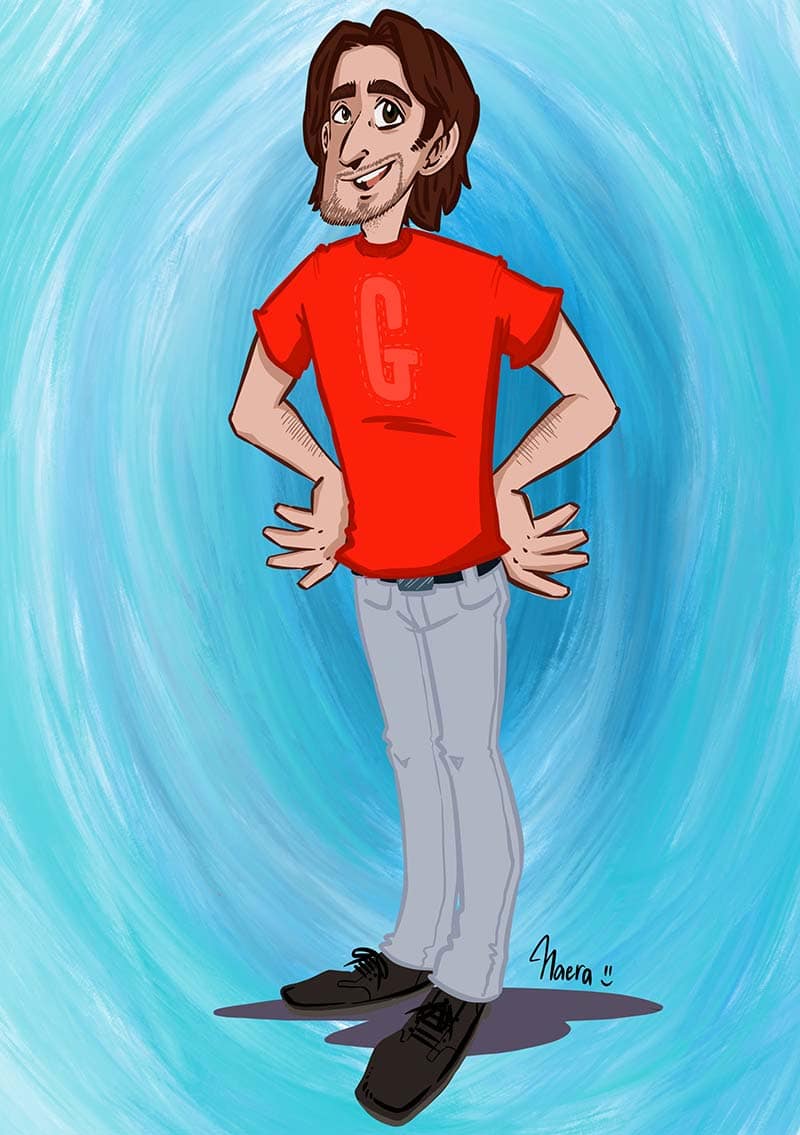 Ritratto a fumetti di Giordan (mio marito), una delle sue innumerevoli caricature. Questa, completamente digitale, il cui stile è leggermente diverso dal solito.